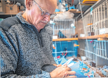 Reinhard Rademacher putzt eine seiner süddeutschen Schildtauben.